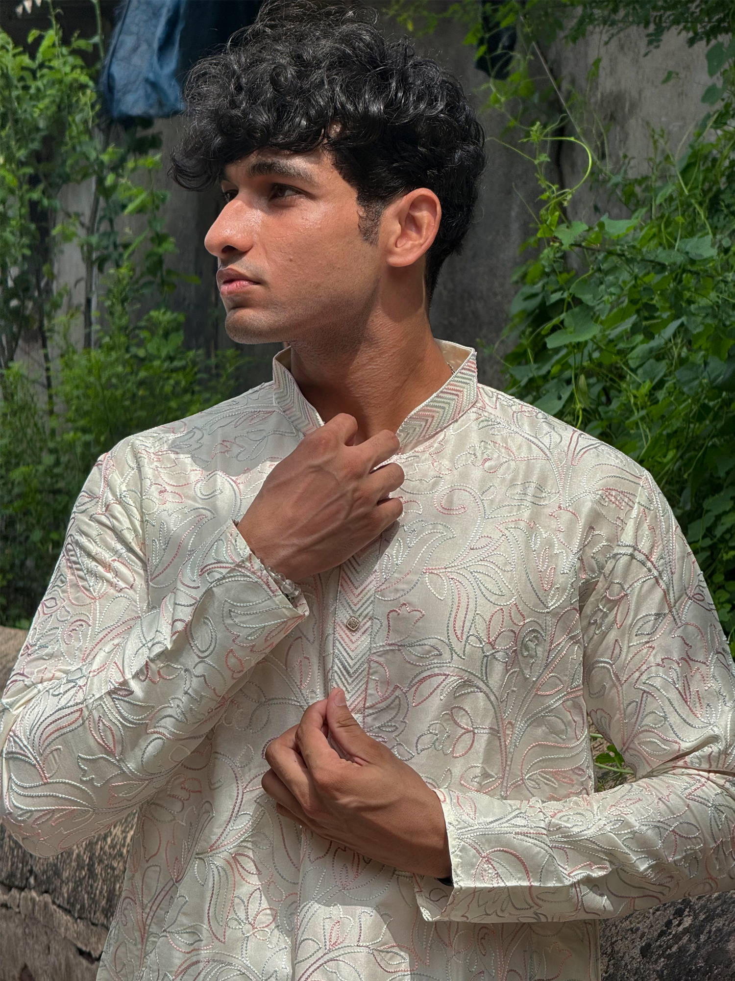 Cream Kurta Trouser Set With Multi Thread Work Haldi/Mehendi Concept