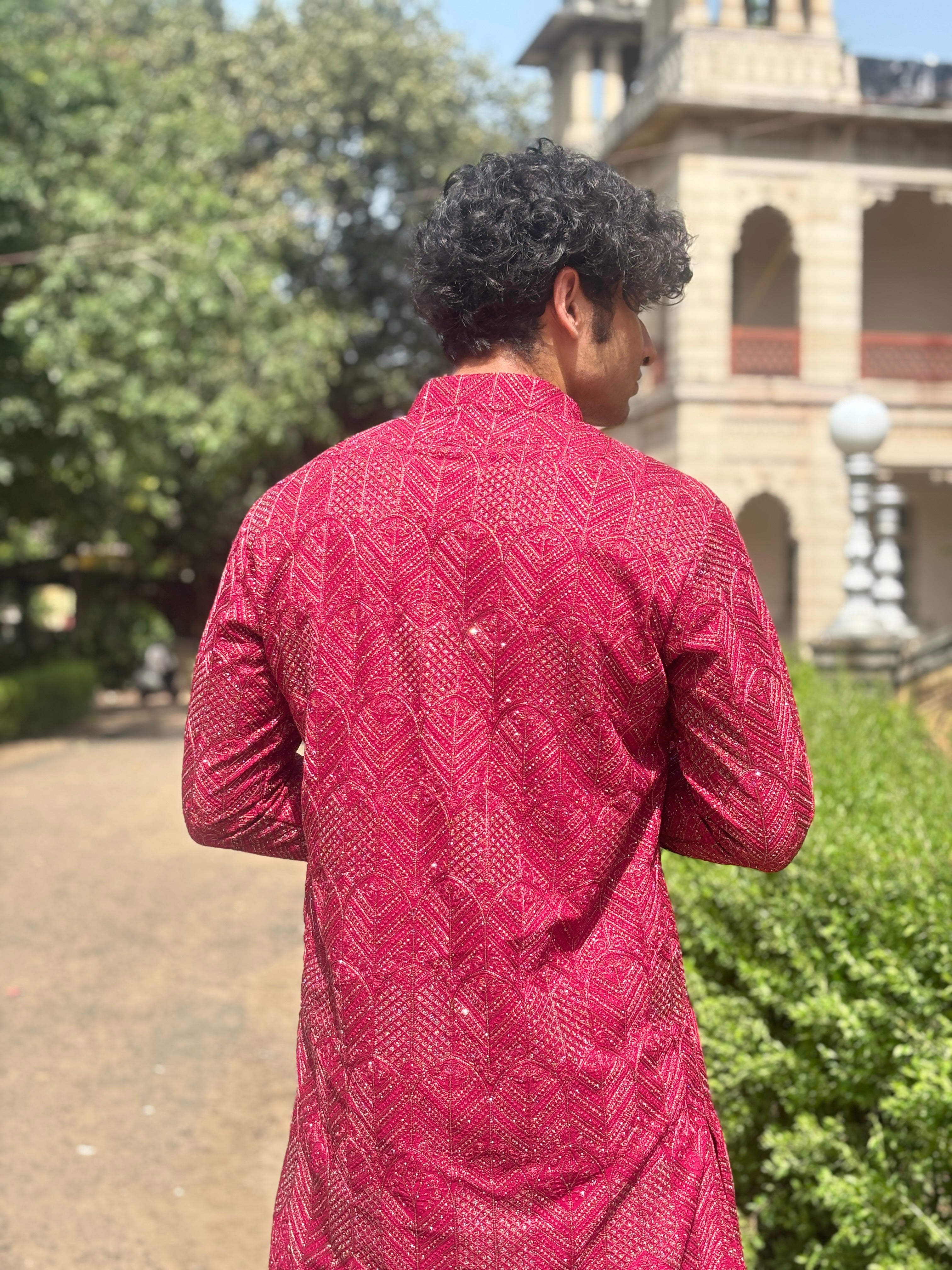Red Brocket Silk Kurta Set